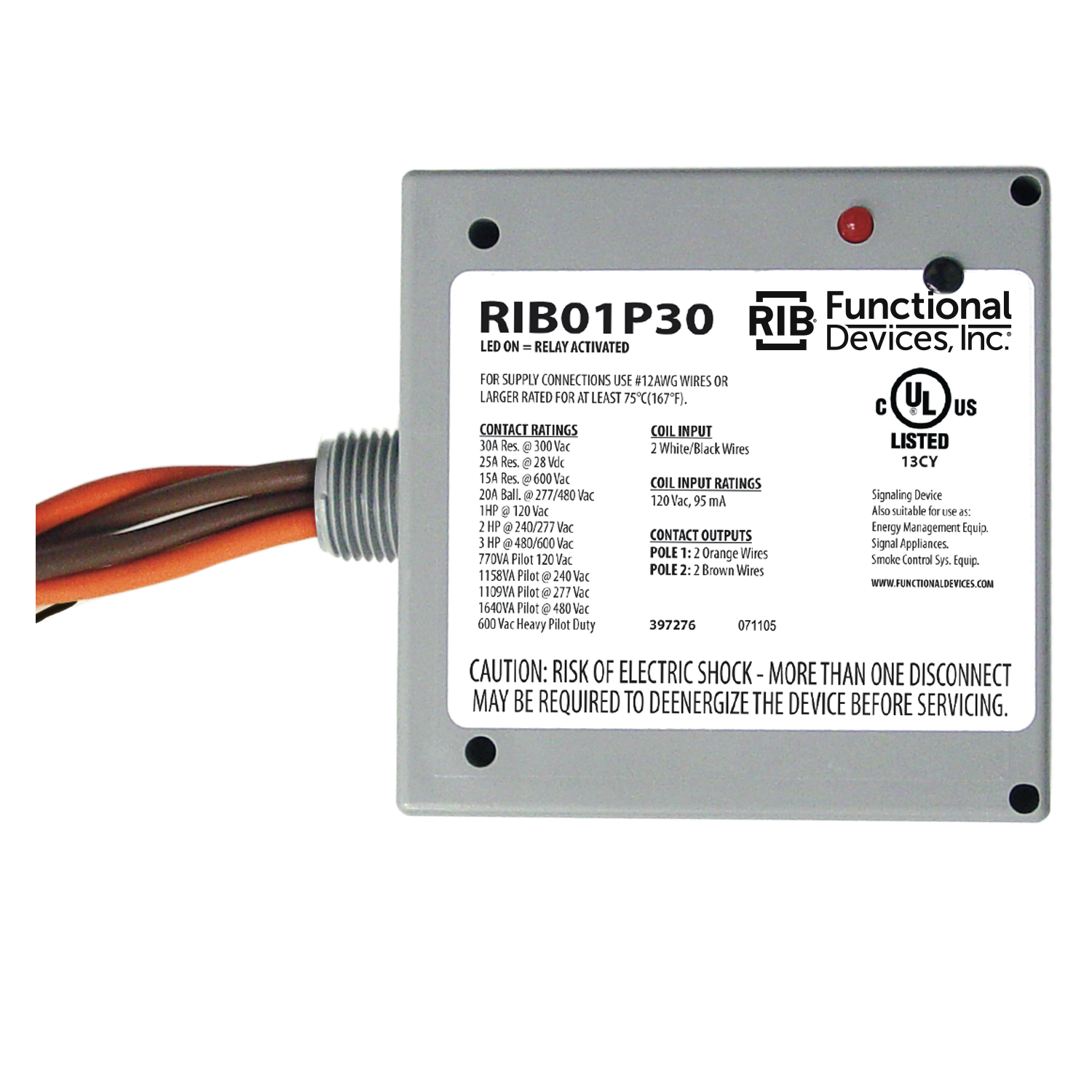 Enclosed Power Control Relay; Type AC Operated; Coil Voltage 120 Volt AC at 50/60 Hertz; Contact Voltage Rating 300/600 Volt AC (Resistive), 28 Volt DC (Resistive), 277 to 480 Volt AC (Ballast), 120 to 600 Volt AC (Pilot Duty); Contact Current Rating 15/25/30 Amp (Resistive), 20 Amp (Ballast); Contact Configuration DPDT; Enclosure NEMA 1; Approval UL 916/864, CUL, UL (Canada and US), CE; RoHS Compliant; Overall Dimension 4 Inch Width x 1.8 Inch Depth x 4 Inch Height; Coil Current 105 Milliamp at 120 Volt AC; Power Rating 770 to 1640 Volt Amp (Pilot Duty), 1/2/3 HP; Operate Time 18 Millisecond; Operating Temperature -30 to 140 Deg F; Humidity Range 5 to 95 Percent; Includes LED, 16 Inch 600 Volt Rated Wire, 0.5 Inch Threaded Nipple