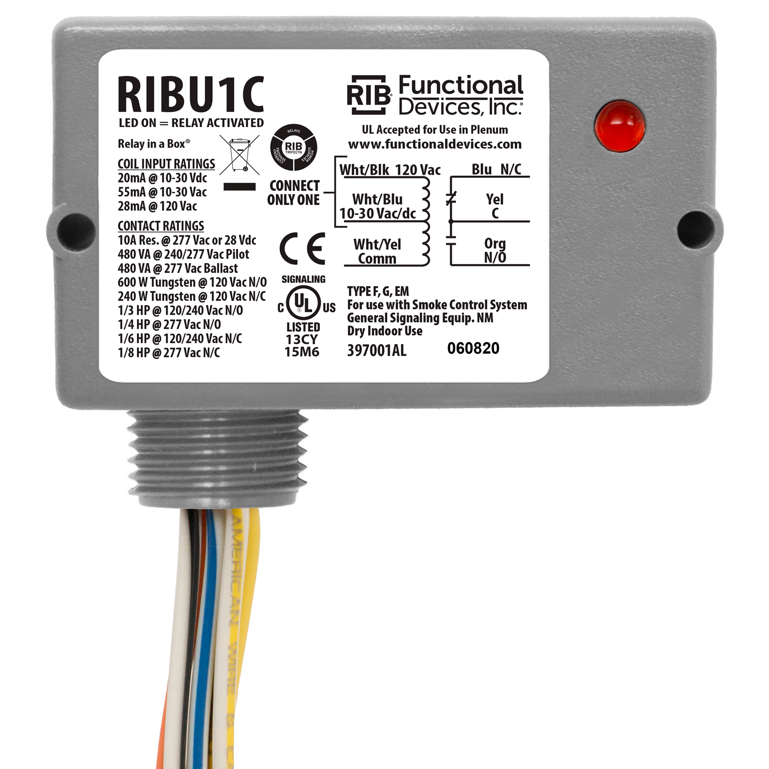 Enclosed Pilot Control Relay; Type AC/DC Operated; Coil Voltage 10 to 30/120 Volt AC at 50 to 60 Hertz, 10 to 30 Volt DC; Contact Voltage Rating 277 Volt AC (Resistive), 28 Volt DC (Resistive), 277 Volt AC (Ballast), 240 to 277 Volt AC (Pilot Duty), 120 Volt AC (Tungsten), 120 to 240 Volt AC (NO), 120 to 240 Volt AC (NC), 277 Volt AC (NO/NC); Contact Current Rating 10 Amp (Resistive); Contact Configuration SPDT; Enclosure NEMA 1; Approval UL 916/864, CUL, UL (Canada and US), CE; RoHS Compliant; Overall Dimension 2.8 Inch Width x 1.5 Inch Depth x 1.7 Inch Height; Coil Current 28 Milliamp at 120 Volt AC; Power Rating 240/600 Watt (Tungsten), 1/3 to 1/8 HP; Operate Time 20 Millisecond; Operating Temperature -30 to 140 Deg F; Humidity Range 5 to 95 Percent; Includes LED, 16 Inch 600 Volt Rated Wire, 0.5 Inch Threaded Nipple