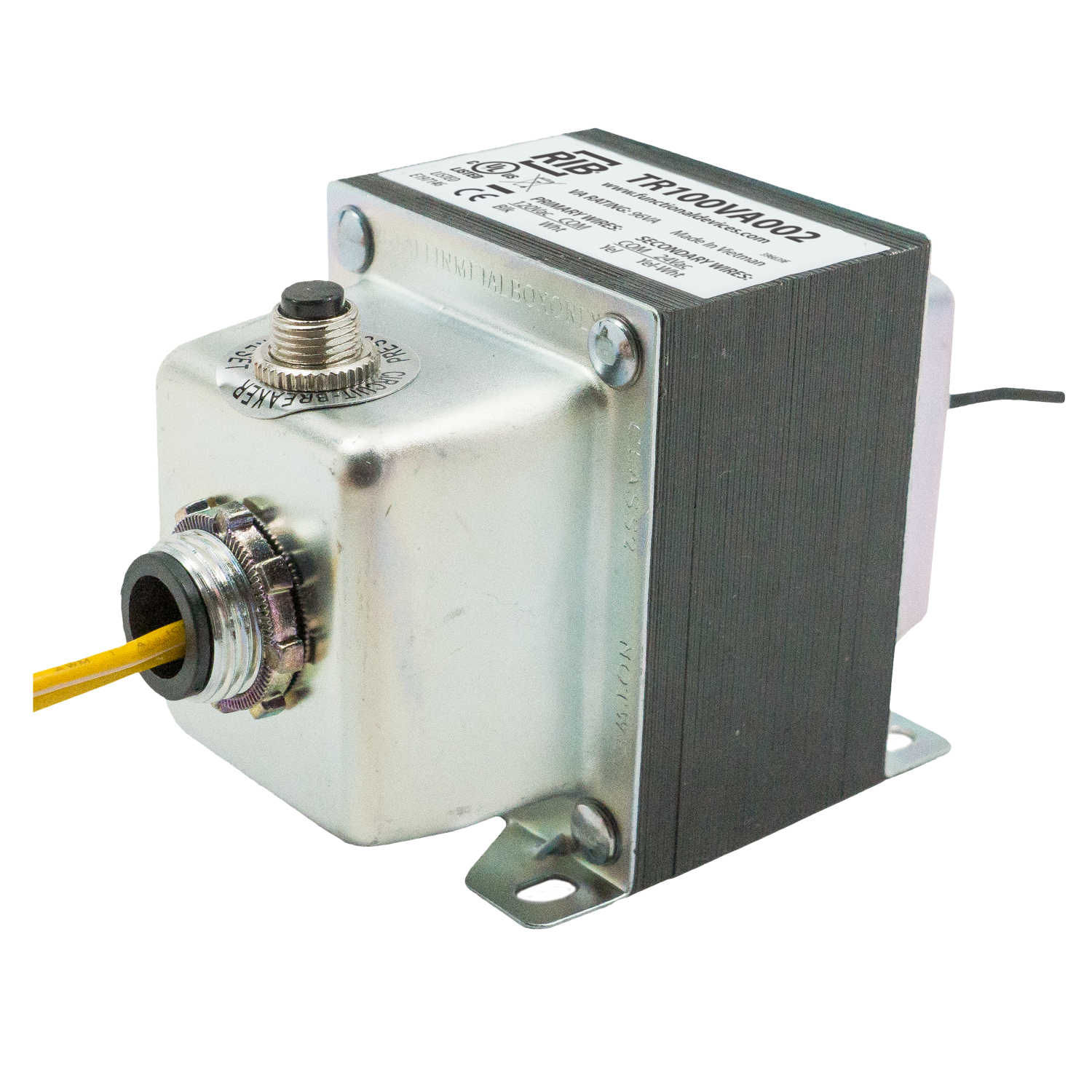 Transformer; Type Class 2 Current Limiting; Primary Voltage 120 Volt AC at 50/60 Hertz; Secondary Voltage 24 Volt AC at 50/60 Hertz; Power Rating 100 Volt Amp; Terminal Type 8 Inch Wire Lead with 0.5 Inch Strip; Mounting Foot and Dual Threaded Hub; Application Building Automation; RoHS Compliant; Overall Dimension 2.504 Inch Width x 4.077 Inch Depth x 3.023 Inch Height; Operating Temperature -30 to 140 Deg F; Over Current Protection Type Circuit Breaker; MTBF Rating 100000 Hour at 77 Deg F; Construction Type Split-Bobbin; Includes 0.5 Inch Threaded Hub; Approval UL (Canada and US), CE
