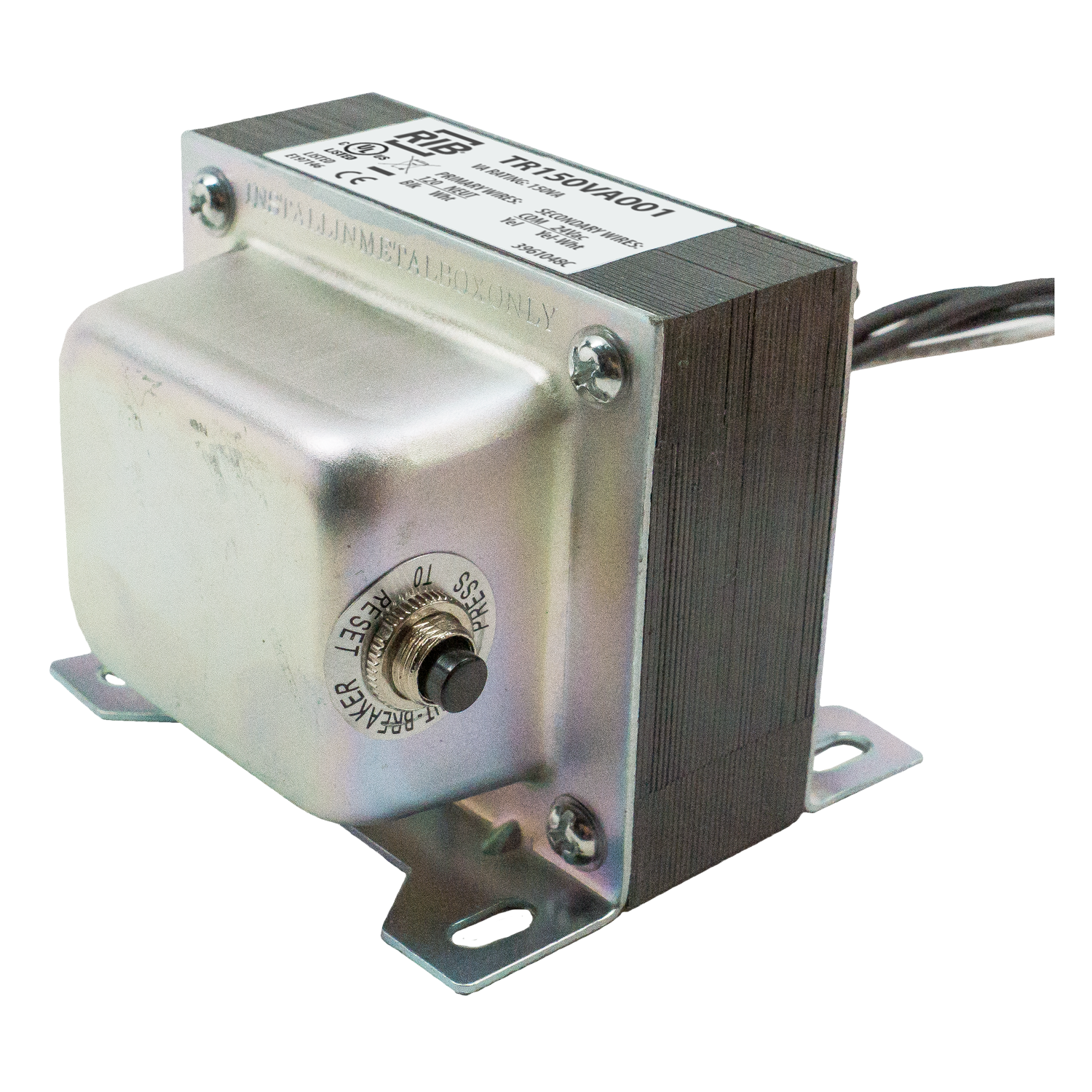 Transformer; Type Class 2 Current Limiting; Primary Voltage 120 Volt AC at 50/60 Hertz; Secondary Voltage 24 Volt AC at 50/60 Hertz; Power Rating 150 Volt Amp; Terminal Type 9.5 Inch Wire Lead with 0.5 Inch Strip; Mounting Foot and Single Threaded Hub; Application Building Automation; RoHS Compliant; Overall Dimension 3.8 Inch Width x 3.65 Inch Depth x 3.183 Inch Height; Operating Temperature -30 to 140 Deg F; Over Current Protection Type Circuit Breaker; MTBF Rating 100000 Hour at 77 Deg F; Construction Type Split-Bobbin; Includes 0.5 Inch Threaded Hub; Approval UL (Canada and US), CE