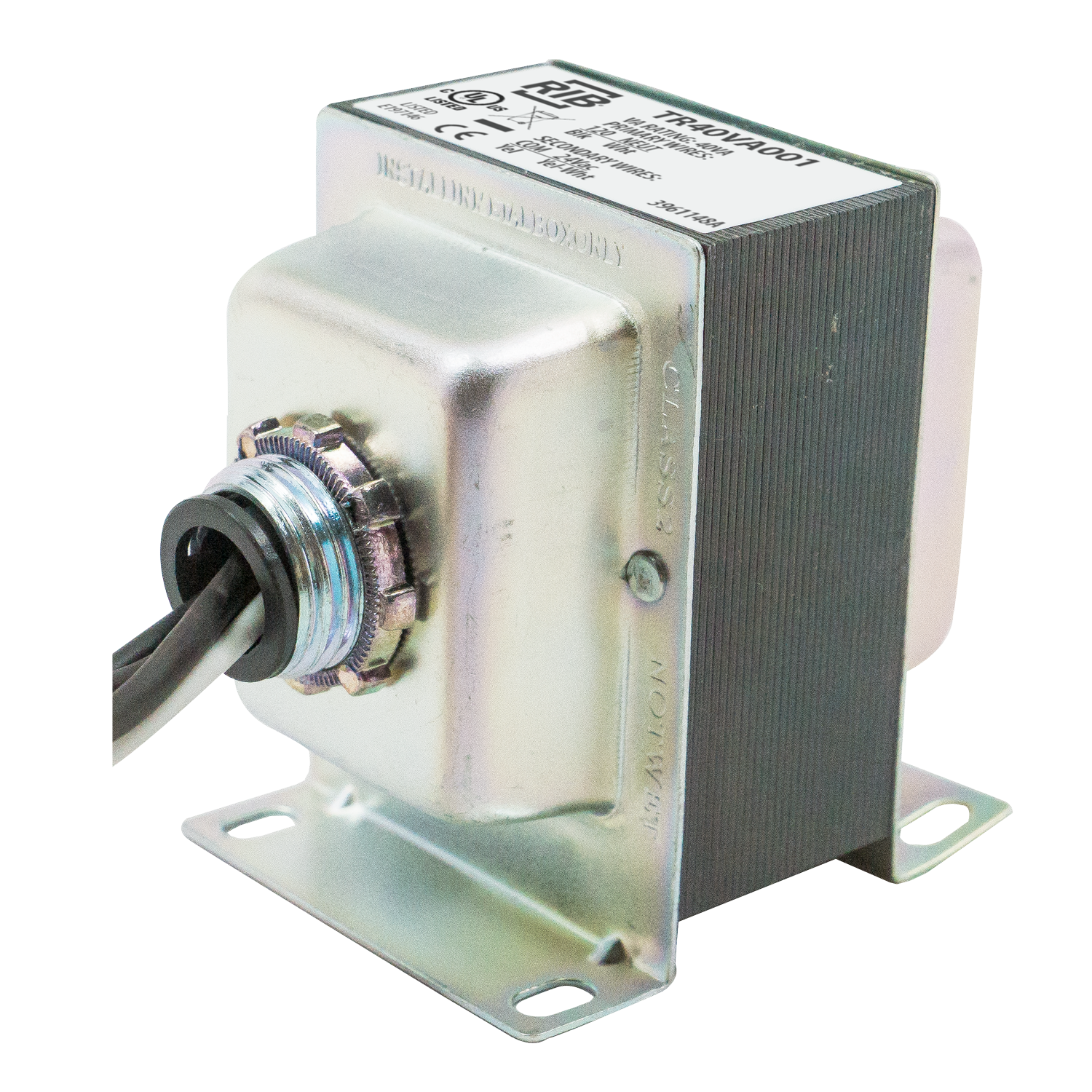 Transformer; Type Class 2 Current Limiting; Primary Voltage 120 Volt AC at 50/60 Hertz; Secondary Voltage 24 Volt AC at 50/60 Hertz; Power Rating 40 Volt Amp; Terminal Type 8 Inch Wire Lead with 0.5 Inch Strip; Mounting Foot and Single Threaded Hub; Application Building Automation; RoHS Compliant; Overall Dimension 2.169 Inch Width x 2.607 Inch Depth x 2.906 Inch Height; Operating Temperature -30 to 140 Deg F; Over Current Protection Type Circuit Breaker; MTBF Rating 100000 Hour at 77 Deg F; Construction Type Split-Bobbin; Includes 0.5 Inch Threaded Hub; Approval UL (Canada and US), CE