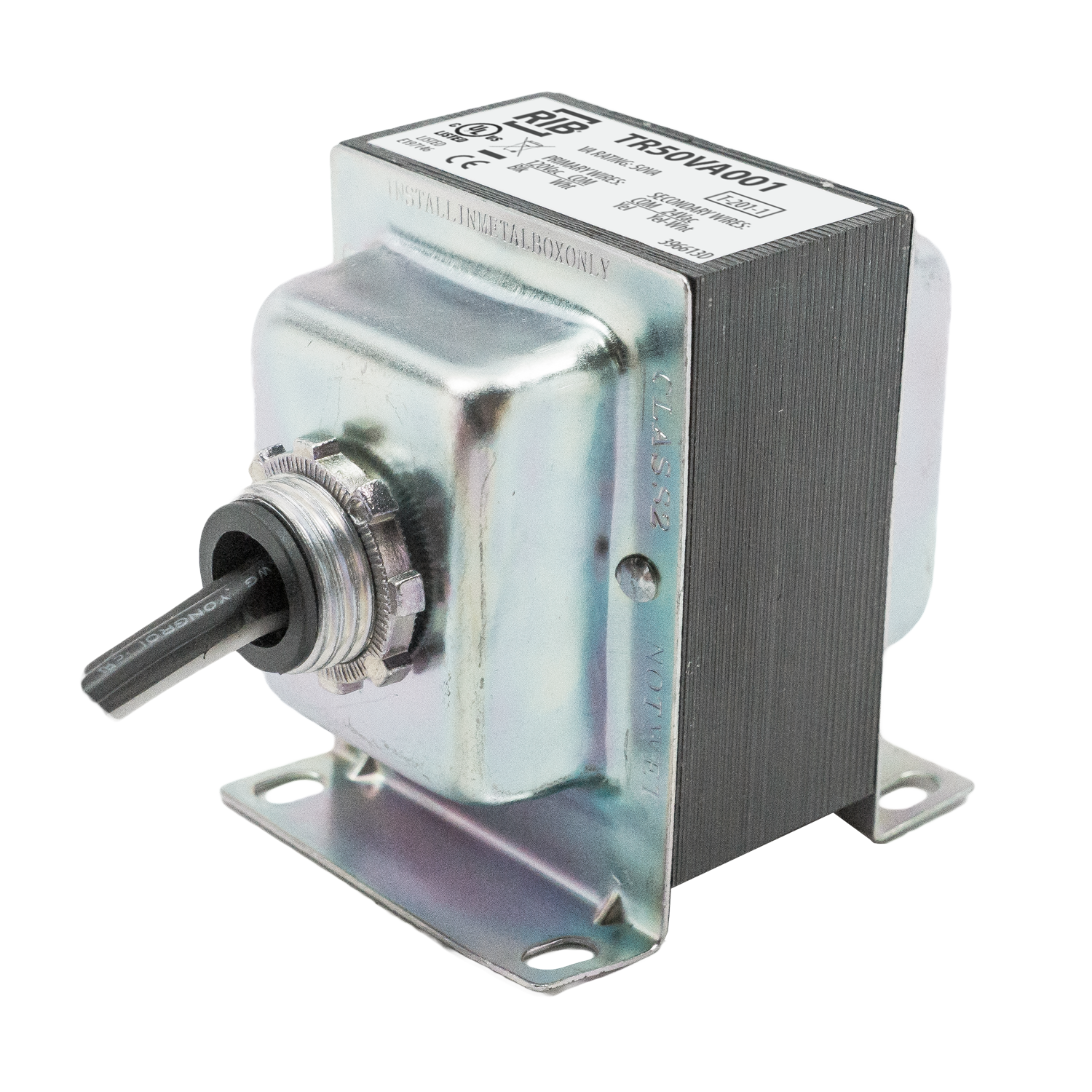Transformer; Type Class 2 Current Limiting; Primary Voltage 120 Volt AC at 50/60 Hertz; Secondary Voltage 24 Volt AC at 50/60 Hertz; Power Rating 50 Volt Amp; Terminal Type 8 Inch Wire Lead with 0.5 Inch Strip; Mounting Foot and Single Threaded Hub; Application Building Automation; RoHS Compliant; Overall Dimension 2.178 Inch Width x 2.677 Inch Depth x 2.879 Inch Height; Operating Temperature -30 to 140 Deg F; Over Current Protection Type Circuit Breaker; MTBF Rating 100000 Hour at 77 Deg F; Construction Type Split-Bobbin; Includes 0.5 Inch Threaded Hub; Approval UL (Canada and US), CE