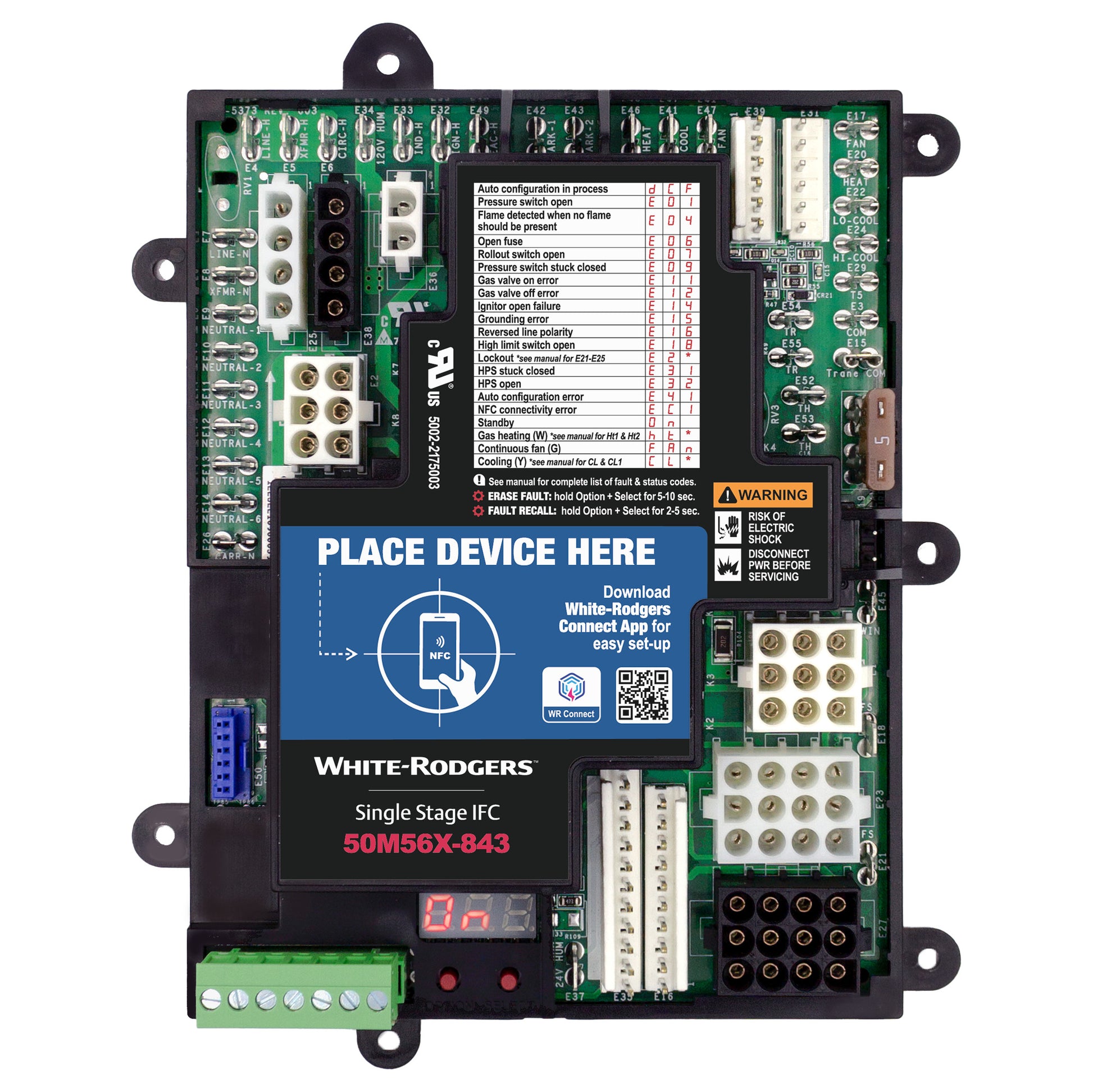 Universal Single Stage HSI Integrated Furnace Control For PSC & ECMX Blower Motors. Includes Universal 120V Silicon Nitride Ignitor And Utilizes The White Rodgers Connect App For Simple Configuration And Diagnostics. Replaces 550+ Models 50X57-843